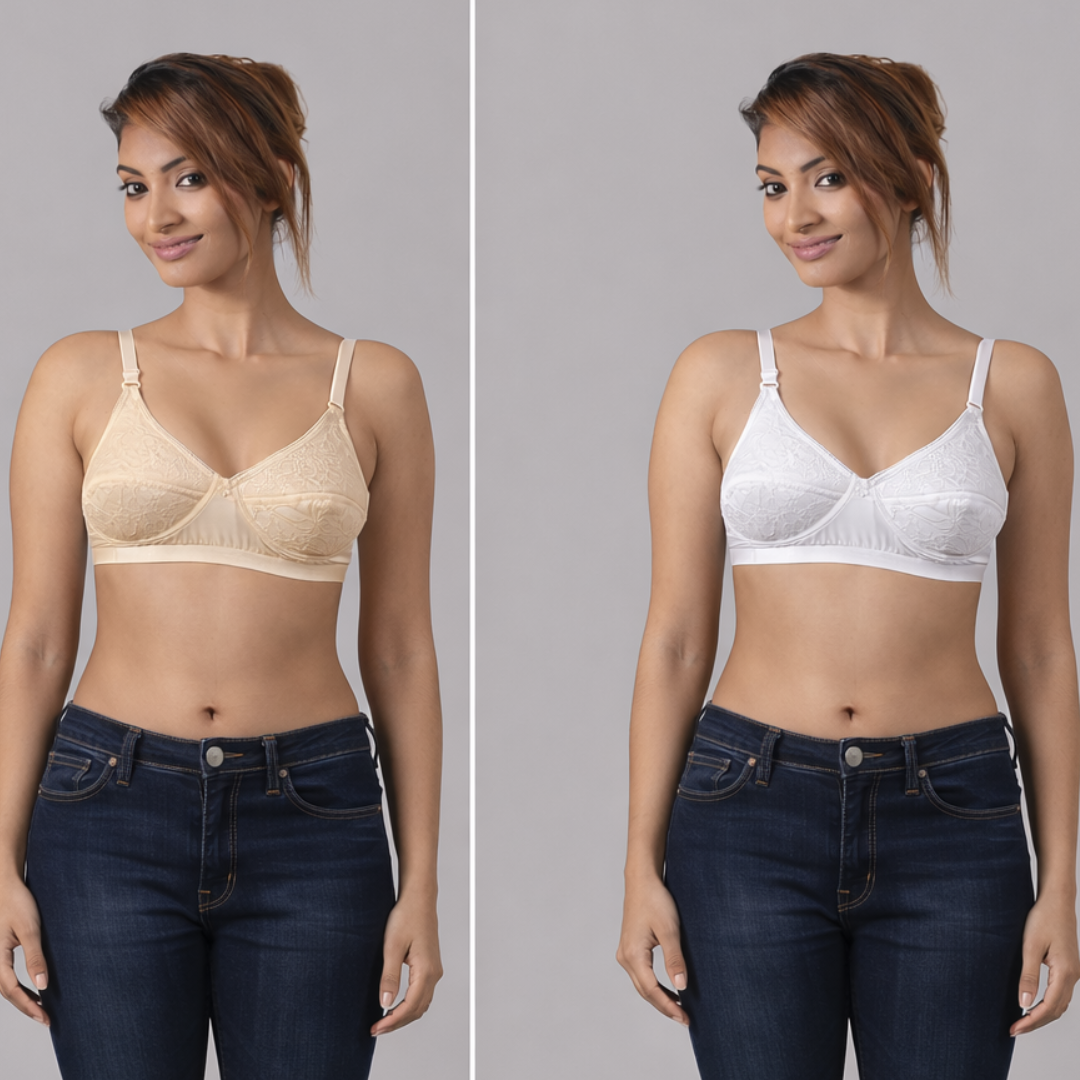 This is an essential white full-coverage bra designed for optimal comfort and support throughout the day. It features a classic, wire-free construction, making it perfect for those who prioritize a natural fit over rigid shaping