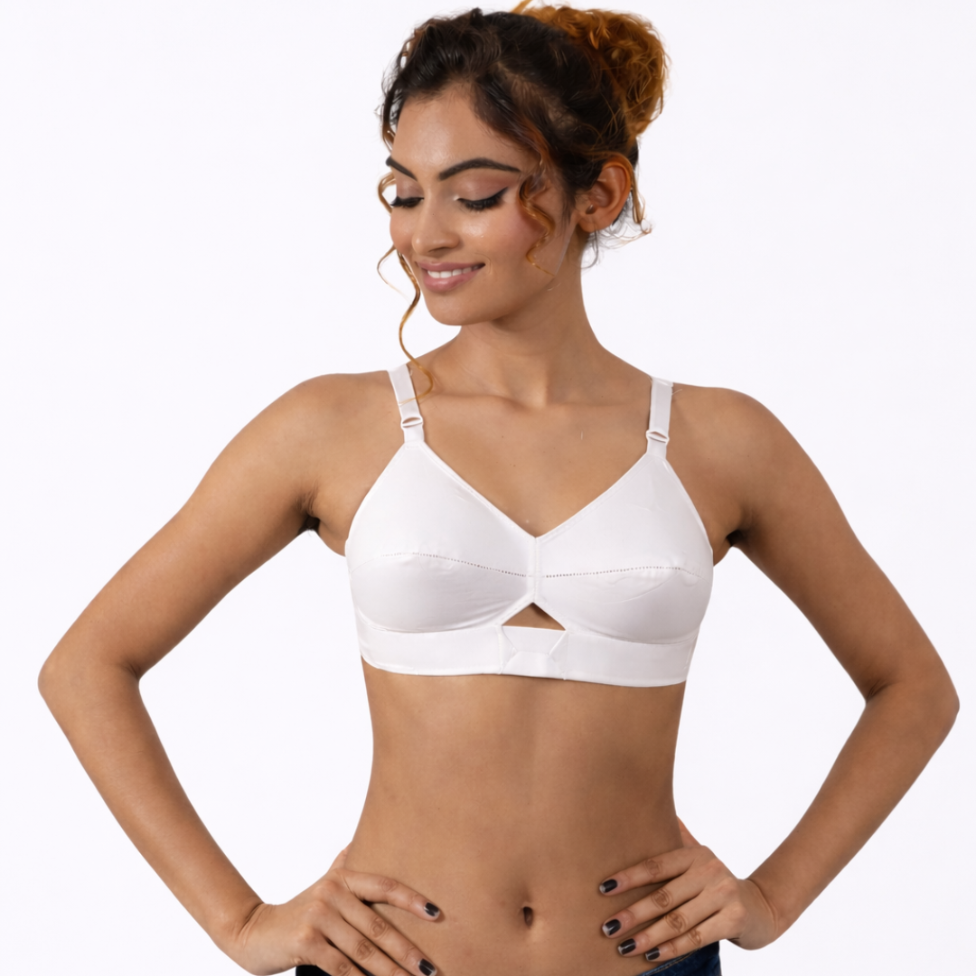 The non-padded cups offer a smooth silhouette and a secure fit, making it an excellent choice for everyday use. A striking design detail is the small, stylish keyhole cutout at the center gore, adding a contemporary and fashionable touch to a classic piece. The bra is finished with adjustable shoulder straps and a broad elastic underband, ensuring the garment stays securely in place while providing reliable lift and support. Its simple yet elegant design makes it an essential staple for any lingerie collection, perfect for wearing under light-colored clothing.