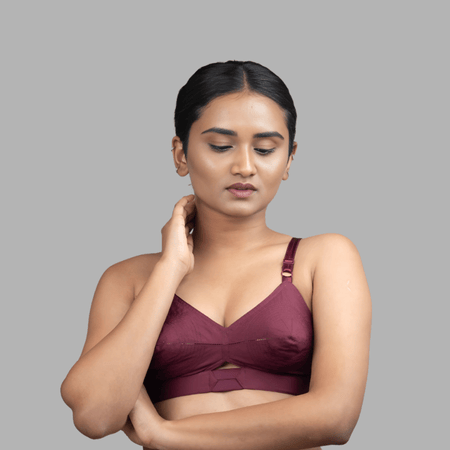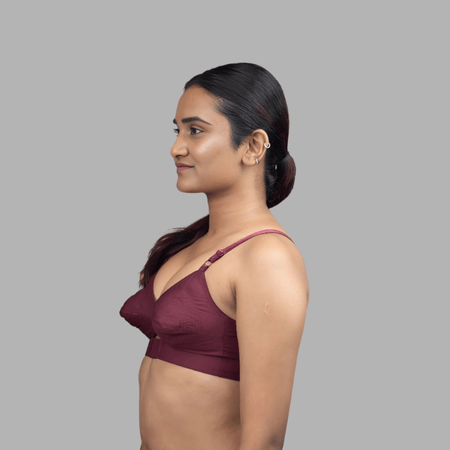 This is a deep maroon or burgundy brassiere designed for superior support and full coverage, making it ideal for daily wear. The bra features non-padded, structured cups, likely with a multi-part construction to ensure excellent shape and lift. Its wide, adjustable shoulder straps are built for comfort, helping to distribute weight and prevent digging. A subtle, elegant pattern covers the fabric, adding a touch of sophistication to this highly functional and supportive foundation garment.